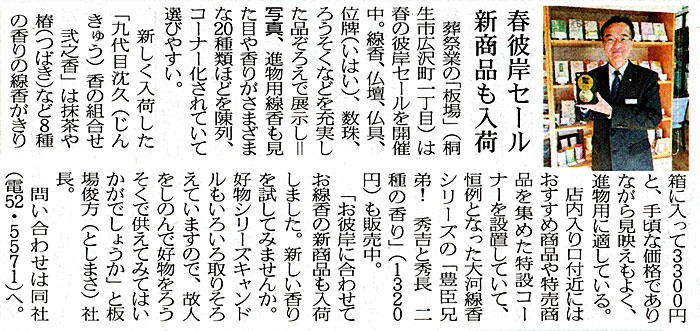 桐生タイムス 街かど新情報 に 弊社「春の新作線香が入荷」の記事が掲載されました。